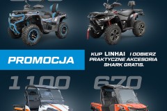 Cena konkurencyjna wyposażenie bogate! Linhai 370 Promax oferuje bogate wyposażenie w standardzie. Oprócz oświetlenia LED, atrakcyjne felgi aluminiowe z markowymi oponami, wyciągarka elektryczna 3000lbs i pilotem, hak holowniczy, masywne zderzaki przedni i tylny, nowoczesne bagażniki kompozytowe, osłony na dłonie czy praktyczna sygnalizacja akustyczna kierunkowskazów.